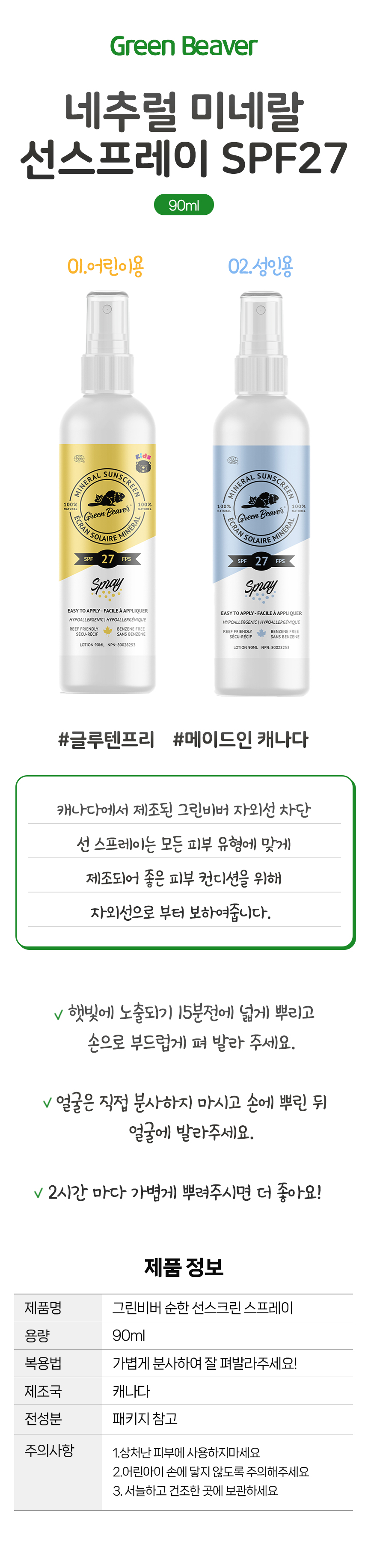 그린비버 순한 선스프레이 키즈 성인 SPF27 90ml 택1