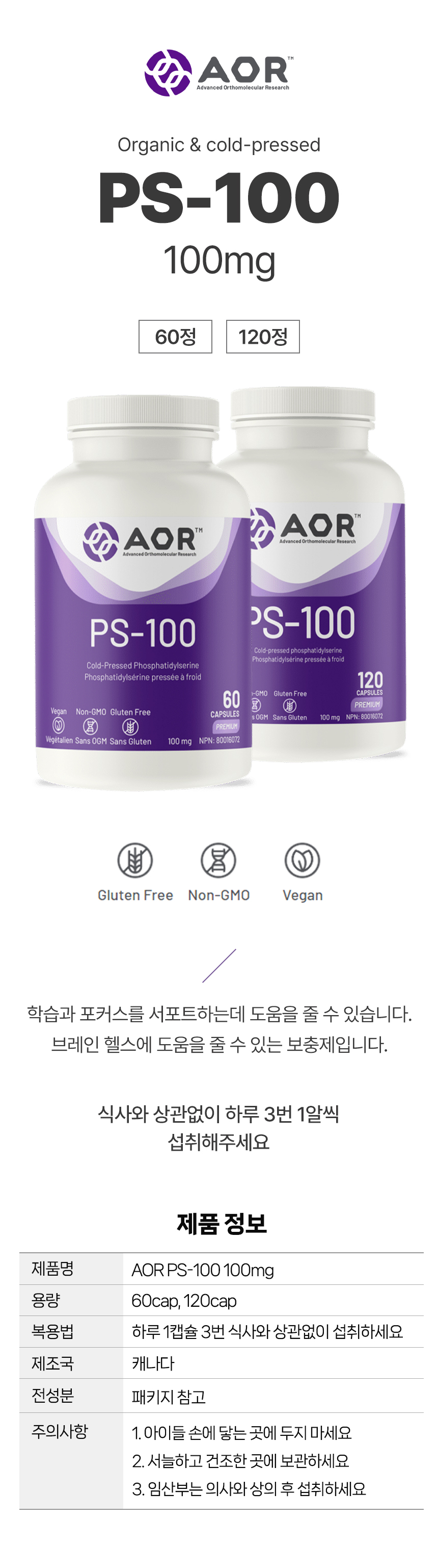 AOR PS100 100mg 브레인 헬스 포커스 60 120캡슐