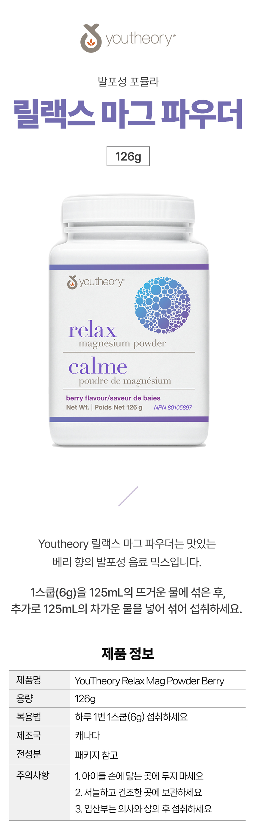 YouTheory 릴렉스 마그 파우더 베리맛 126g