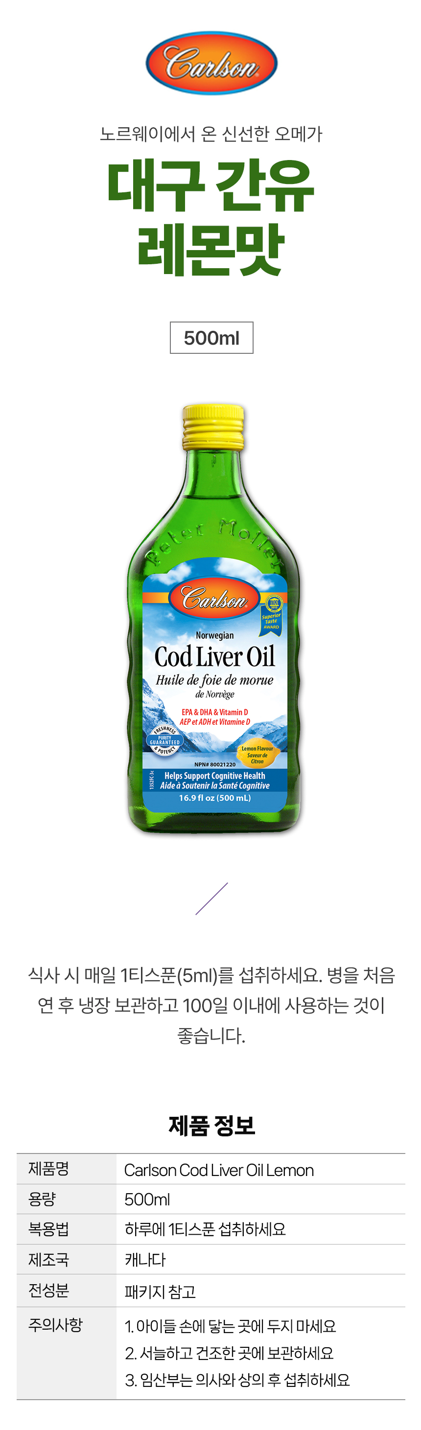 칼슨 대구 간유 코드리버 오일 레몬 500ml