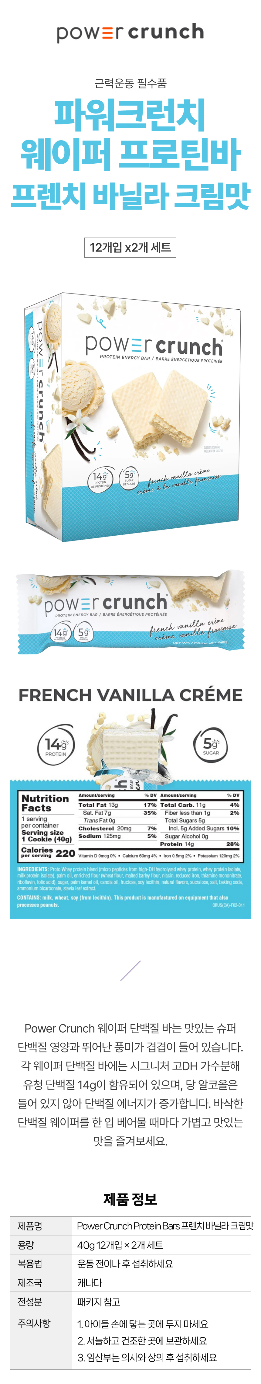 파워크런치 웨이퍼 프로틴바 프렌치 바닐라 크림맛 12개입 2박스