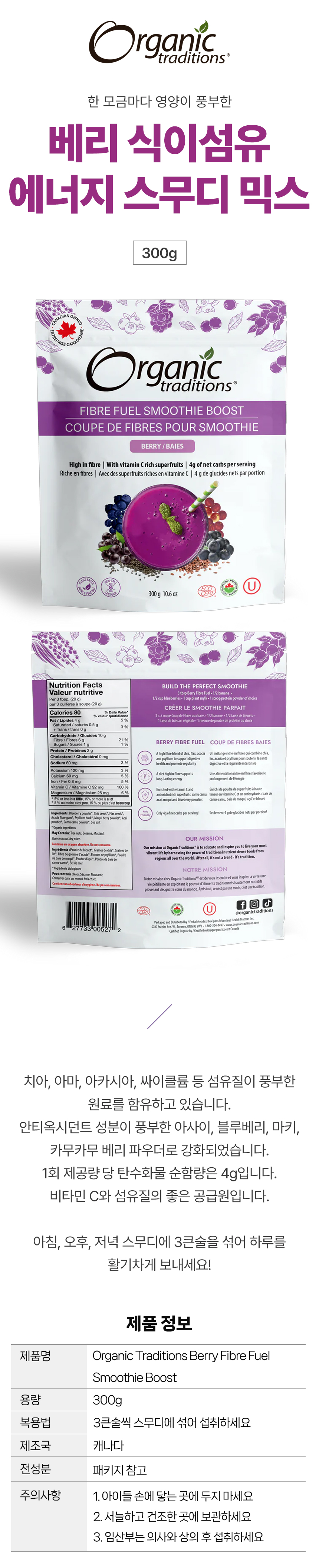오가닉 트래디션스 베리 식이섬유 에너지 스무디 믹스 300g