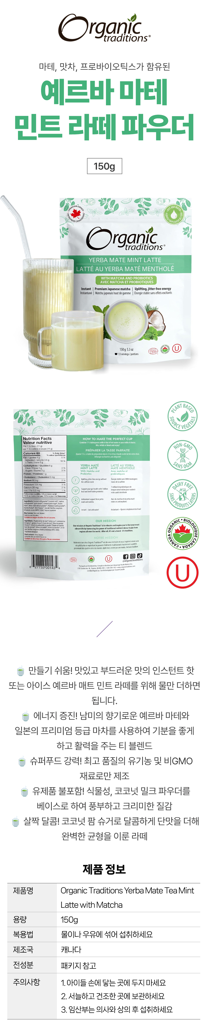 오가닉 트래디션 예르바 마테 민트 라떼 파우더 150g