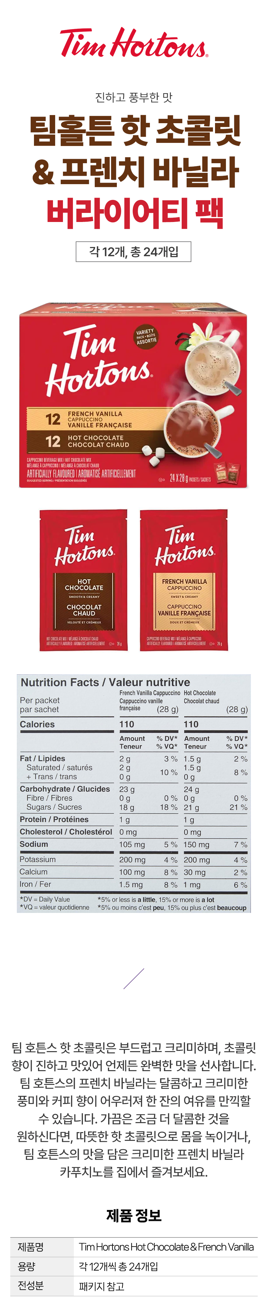 팀홀튼 핫 초콜릿 & 프렌치 바닐라 버라이어티 팩 각12개 총24개입