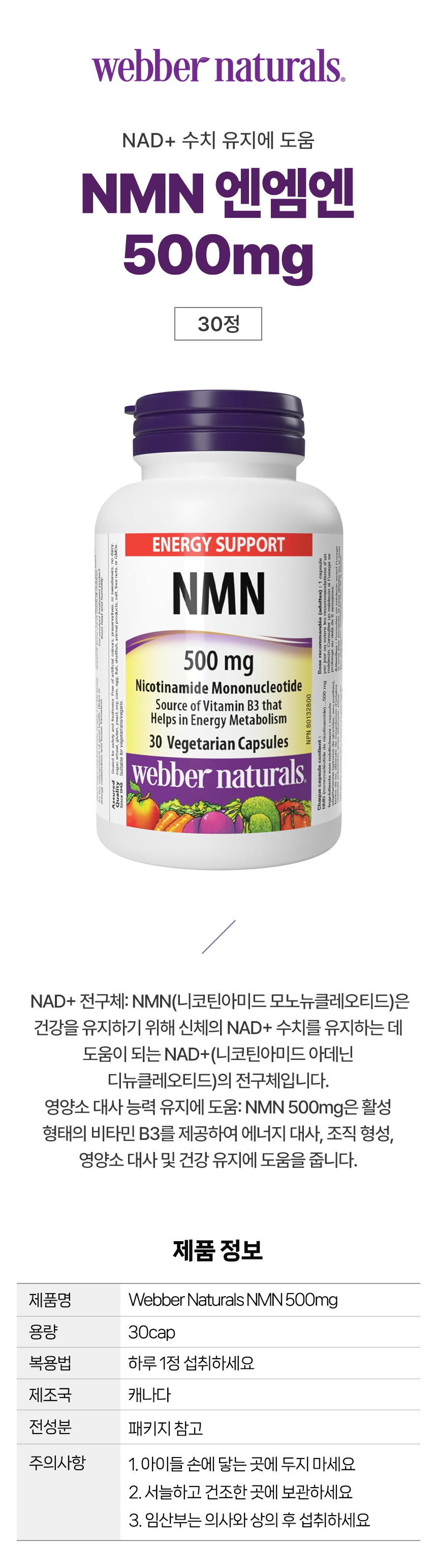 웨버내추럴스 NMN 엔엠엔 500mg 에너지서포트 30정