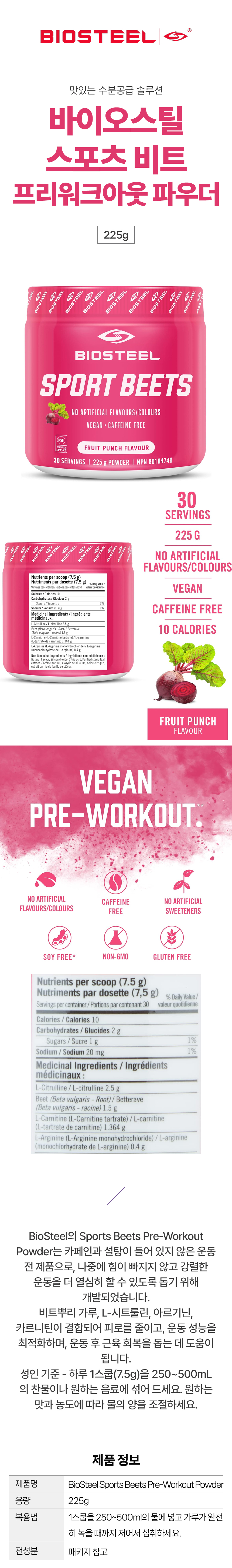 바이오스틸 스포츠 비트 프리워크아웃 파우더 운동전 보충제 프룻펀치맛 225g 30회분