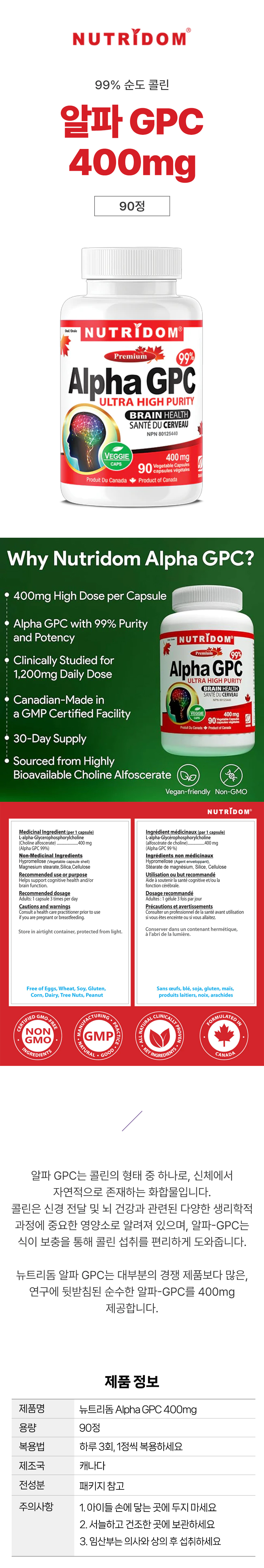 뉴트리돔 알파 GPC 400mg 90정 고순도