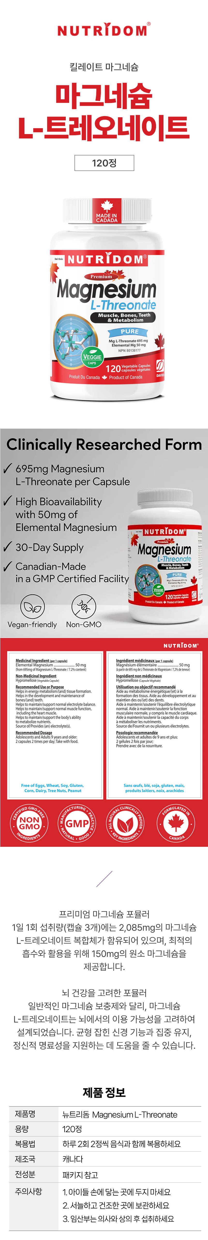 뉴트리돔 마그네슘 L-트레오네이트 120정 고흡수 킬레이트