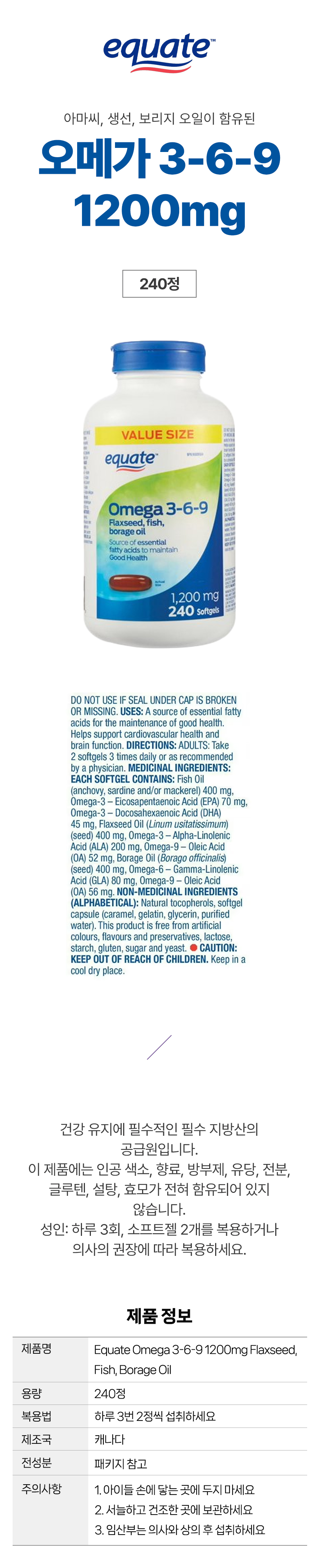 이퀘이트 Equate 오메가 3-6-9 1200mg 240정 아마씨 생선 보리지오일