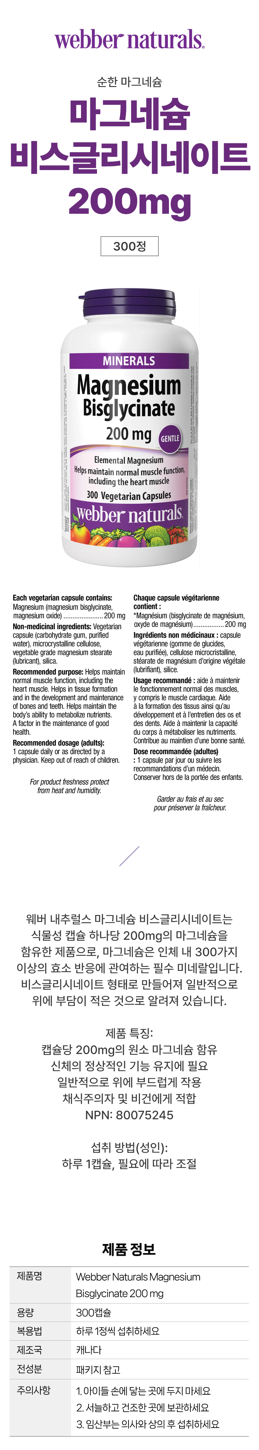 웨버내추럴스 마그네슘 비스글리시네이트 200mg 300정 캐나다 코스트코