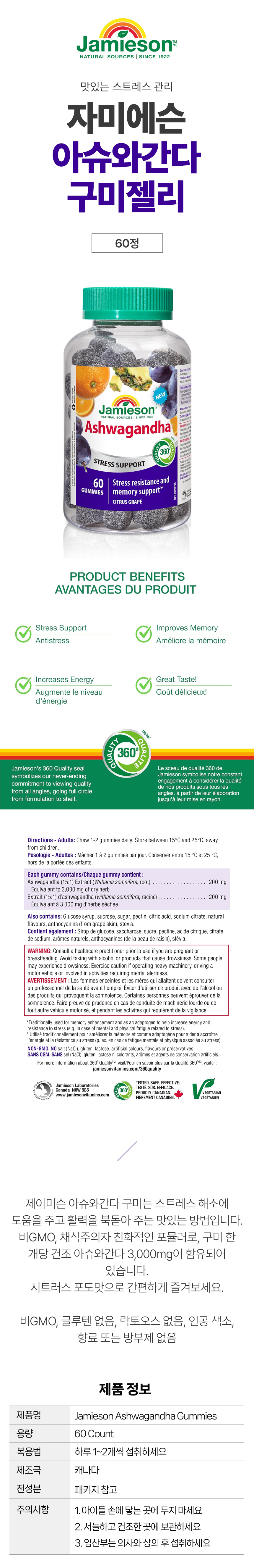 자미에슨 아슈와간다 구미젤리 200mg 60정 맛있는 스트레스 관리