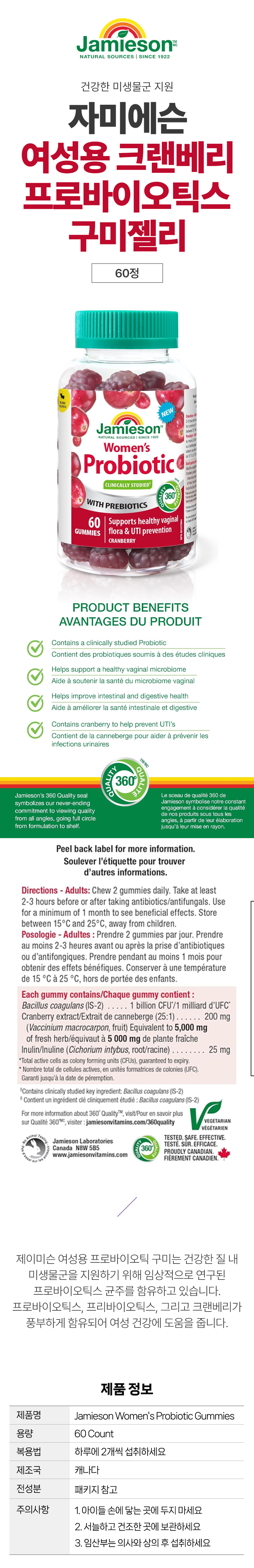 자미에슨 여성용 크랜베리 프로바이오틱스 구미젤리 60정 프리바이오틱 함유