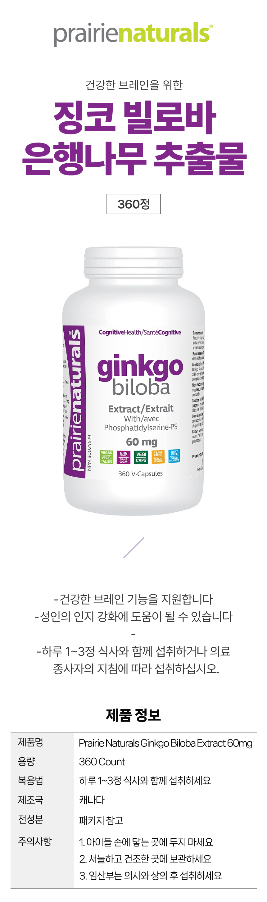 프레리내츄럴스 징코 빌로바 은행나무 잎 추출물 60mg 360캡슐