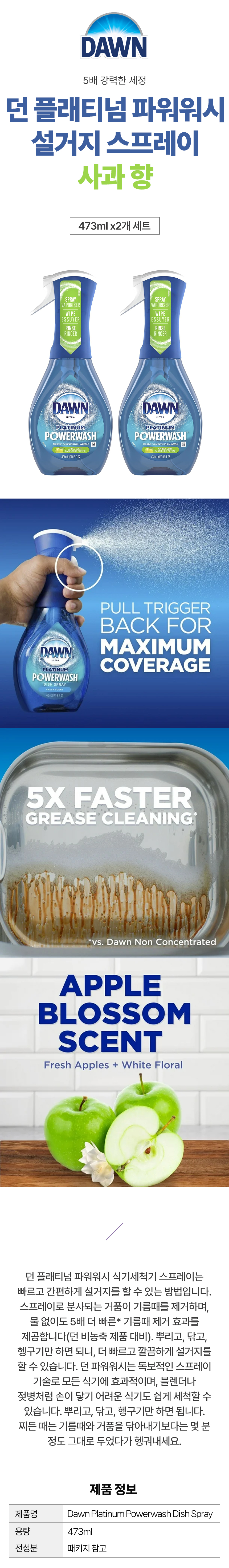 던 DAWN 플래티넘 파워워시 설거지 주방 세제 스프레이 사과향 473ml 2개세트