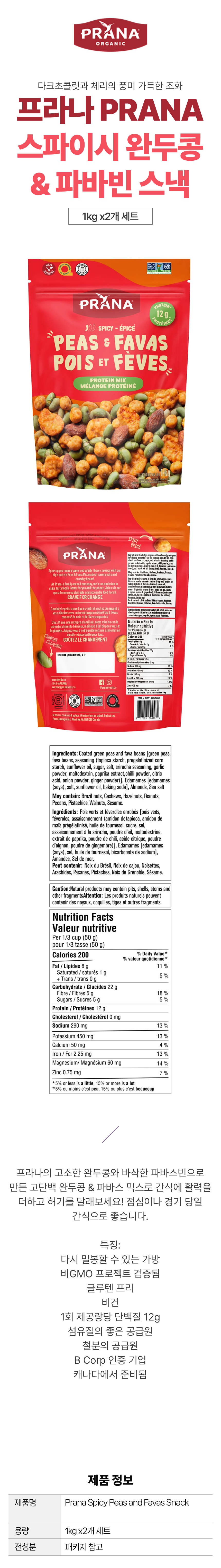 프라나 스파이시 완두콩 & 파바빈 스낵 1kg 2개 세트 캐나다 코스트코