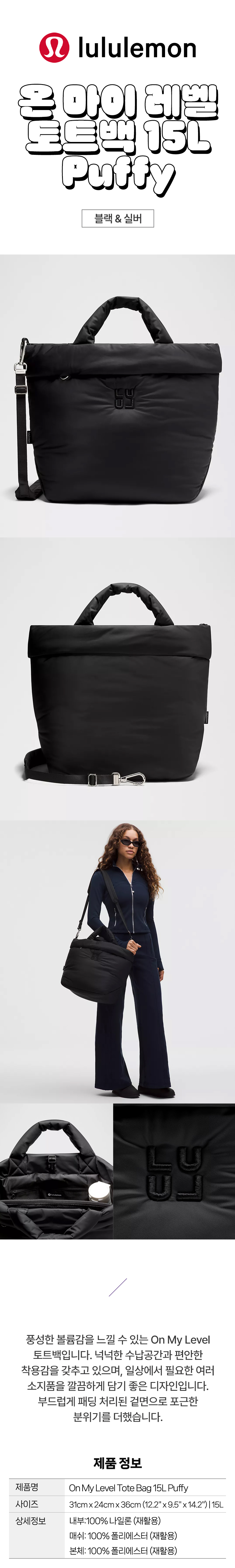 lululemon 룰루레몬 온 마이 레벨 토트백 15L Puffy 캐나다 정품